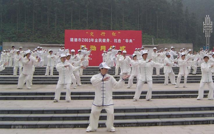美景如画的新安江畔千岛湖旁,太极健身热潮正风起云涌。由我市陈氏太极拳名师方艇老师发起组建的建德市太极拳协会于去年10月成立以来,短短的几个月时间,从只有200多会员发展到现在已近500人左右;协会发展至今,已举办了20多项太极健身活动,参加人员达两千多人次。至于发展迅捷的势头,一是来源于民间的太极拳爱好者众,现在又有陈正雷大师创编的易于被人接受的简易陈氏精要18式太极拳作为普及项目,使得加入太极健身行列的人越来越多。由于原来没有一个好的管理组织去引导,所以爱好者们就象一盘散沙,只能各自练自个儿的;现在有了太极拳协会,且又将活动搞的蒸蒸日上,使太极拳爱好着们感觉到健身有了交流、切磋、提高的去处,纷纷加入健身的热潮,积极参与各项太极拳演练、交流活动。建德市太极拳协会自五月份的第三届“世界太极拳健身月”陈氏太极拳精要18式教学和“抗非典--健身心”的陈氏太极拳精要18式竞赛、汇报表演及其他太极拳、械竞赛表演活动开展以来,在本月又组织百人参加了由体育局主办的抗非典“全民健身月”活动,上百人在台上共演了陈氏精要18式太极拳,受到市领导和广大市民、太极拳爱好者们的好评。并且在这全民健身月中,本协会的各个辅导站(分会)、健身队,都纷纷搞起了本站(队)的太极健身演练、交流热潮,如本月1日的寿昌辅导站的陈氏精要18式竞赛与表演穿插进行的演练活动(40多人参加);7日本协会组织的百人一起演练陈氏精要18式活动;8日陈式辅导站的百人共演精要18式活动;14日的组织百多人的队伍参加市“全民健身月”活动启动仪式;15日梅城辅导站(50多人参加)的太极拳、械交流演练太极拳活动;21日杨式太极拳辅导站的太极拳(50多人参加)、械交流演练活动;22日吴式辅导站(50多人参加)的太极拳、械交流演练活动;及29日在寿昌横山铁合金厂体育馆举行隆重的太极拳健身活动总结汇报表演,共有三百多人到场参加了各个项目的表演,节目丰富而多彩,有太极神韵队的开场锣鼓,有集体和个人的各式太极拳、剑、扇及快子舞、纱巾舞、少林拳、械等。节目进行中引起了阵阵热烈的掌声。见部分活动图片:
